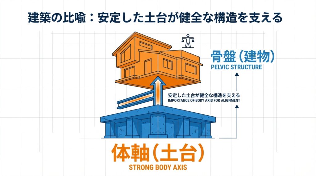 それと同じで、体軸という土台が整っていないと、骨盤だけを整えても、すぐに元に戻ってしまったり、十分な効果が得られなかったりするのです。
